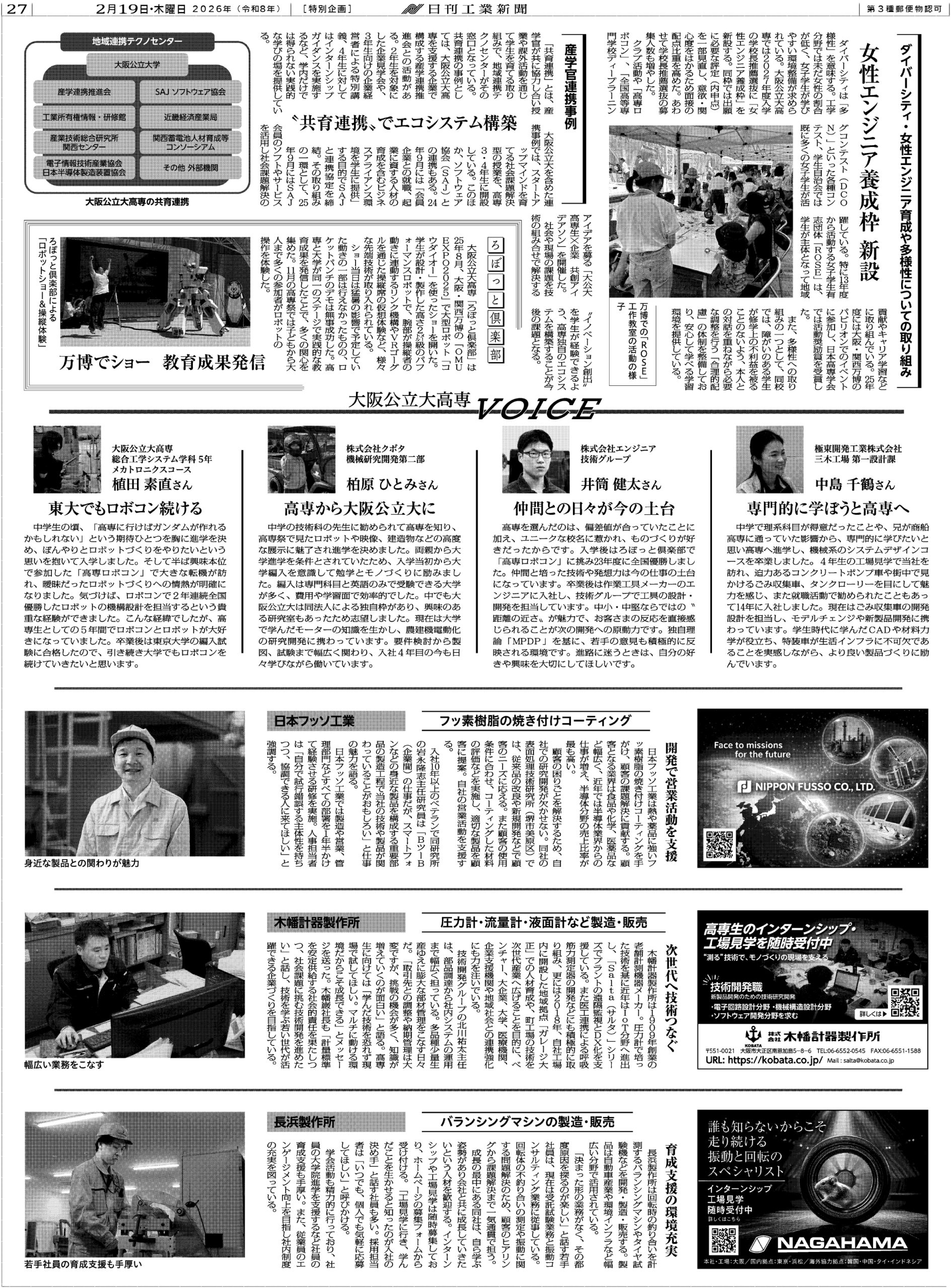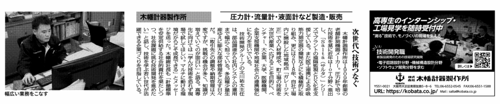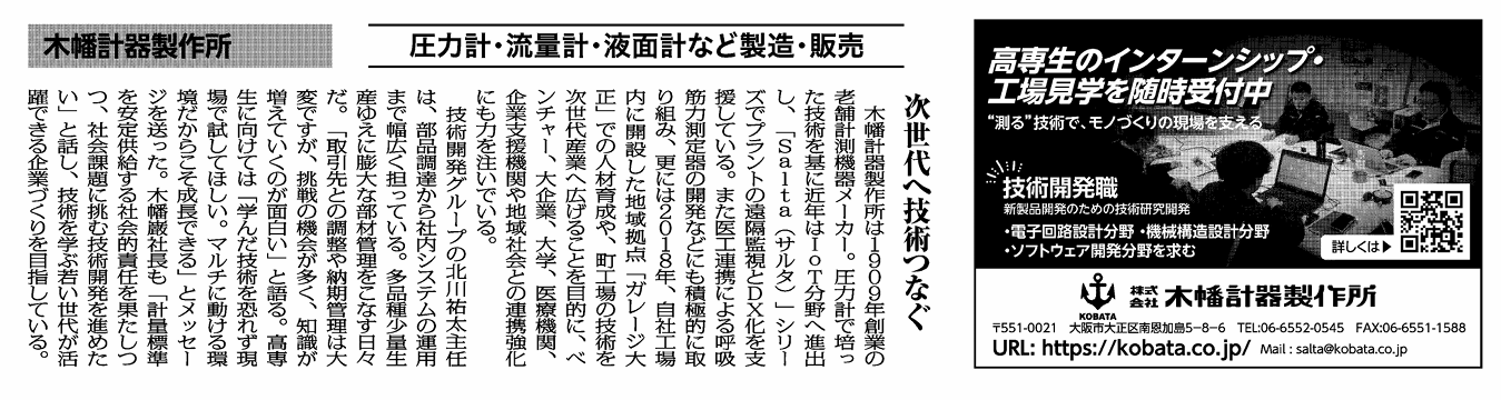 ホーム ニュース 【新聞掲載のお知らせ】日刊工業新聞に掲載されました ニュース 【新聞掲載のお知らせ】日刊工業新聞に掲載されました 2026年3月10日 2026年2月19日付の日刊工業新聞において、当社の取り組みが紹介されました。 記事では、当社が製造・販売する圧力計・流量計・液面計などの計測機器をはじめ、技術開発の取り組みや次世代技術への挑戦、また、企業として次世代のものづくりを担う人材育成にも力を入れており、高専生のインターンシップや工場見学の受け入れなど、教育機関との連携の取り組みについて取り上げていただいております。 ぜひご覧ください。 本件のお問い合わせ お問い合わせ フォームが表示されるまでしばらくお待ち下さい。 恐れ入りますが、しばらくお待ちいただいてもフォームが表示されない場合は、 こちらまでお問い合わせください。